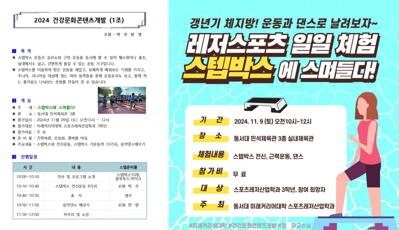 스포츠레저산업학과 학생들이 조를 나누어 실제 스포츠문화콘텐츠 프로그램을 개발하여 운영합니다.
